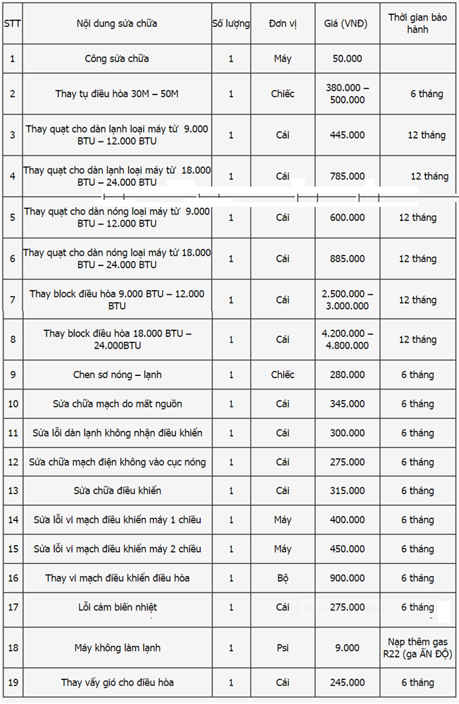 Bảng giá sửa chữa - thay thế linh kiện điều hòa