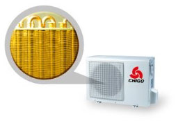 Dàn tản nhiệt của máy điều hòa Chigo được mạ 1 lớp mạ vàng ( hay còn gọi lá tán nhiệt vàng) giúp chống lại các nhân tố ảnh hưởng bào mòn tốt nhất. Sự bảo vệ của dàn tản nhiệt giúp máy kéo dài tuổi thọ vận hành so với các dòng máy điều hòa truyền thống khác.