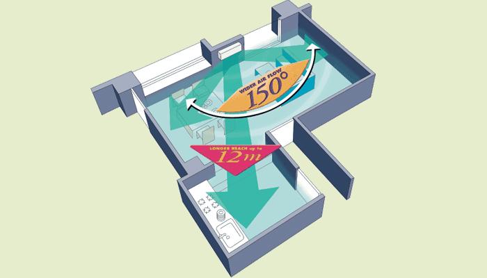 Cánh hướng dòng rộng là các cánh hướng gió có thiết kế đặc biệt, cho phép đẩy gió đi ở một góc lớn nhất và xa nhất trong phòng. Với các cánh hướng dòng này, luồng khí lạnh có thể được thổi đi với phạm vi cực rộng, từ góc đến giữa phòng hoặc bao phủ khắp phòng một cách dễ dàng. Từ đó, khiển điều hòa tác dụng chế độ hướng gió cả căn phòng đều được tận hưởng luồng gió mát theo nhiều hướng đứng lẫn ngang. Bạn có thể tìm thấy chế độ gió này trên các dòng sản phẩm máy lạnh Panasonic và Daikin như: