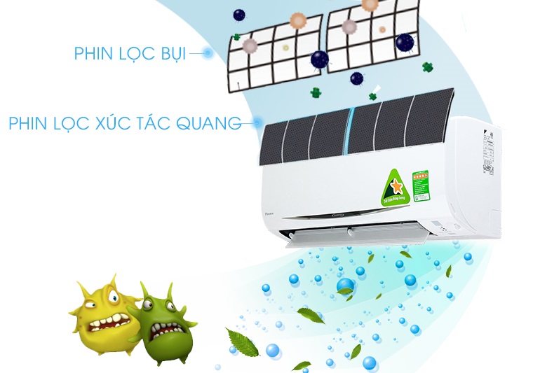 Dưới tác động của ánh sáng mặt trời, xúc tác sẽ hoạt động mạnh mẽ, giúp phân hủy toàn bộ vi khuẩn và virut, dọn sạch nấm mốc trên phin lọc, từ đó triệt tiêu không cho mùi hôi có cơ hội phát triển và lan tỏa trong không khí, trả lại cho bạn một luồng khí lạnh thật sự trong lành và an toàn cho sức khỏe.