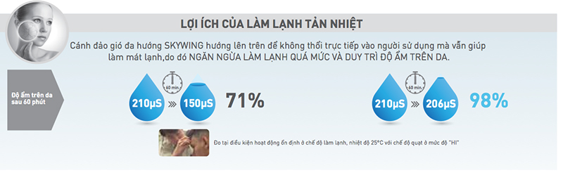 Cánh đảo gió skywing được cải tiến nằm phía trên thân máy giúp thổi gió lên trần nhà tốt hơn. Không khí lạnh men theo trần nhà và tường, lan toả đều khắp phòng giúp làm lạnh đồng đều, dễ chịu. Nhiệt được loại bỏ khỏi trần và tường giúp tạo cảm giác mát lạnh đồng đều khắp phòng hay còn gọi là làm lạnh tản nhiệt