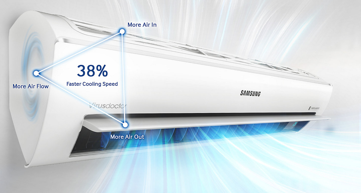 Các dòng sản phẩm điều hòa của Samsung có thiết kế sang trọng tam diện còn phát huy khả năng làm lạnh hiệu quả. Trang bị công nghệ Digital Inverter máy nén 8 cực. Samsung sử dụng máy nén 8 cực thay cho máy nén 4 cực thông thường trong thiết kế dàn nóng, giúp giảm thiểu thời gian cần thiết để động cơ đạt vận tốc tối đa, giảm tiếng ồn và tăng tốc độ làm lạnh hơn bao giờ hết.giúp máy vận hành với hiệu quả vượt trội, làm lạnh tức thì, tiết kiệm điện năng tiêu thụ và hạn chế tiếng ồn. Ngoài ra, thiết kế tam diện độc đáo với miệng hút khí và các góc của miệng thổi khí rộng hơn, cùng với quạt gió lớn hơn giúp làm lạnh nhanh hơn, xa hơn và lan tỏa đều khắp phòng để bạn tận hưởng không khí trong lành thoải mái dù ở bất cứ nơi đâu trong căn phòng nhà bạn.