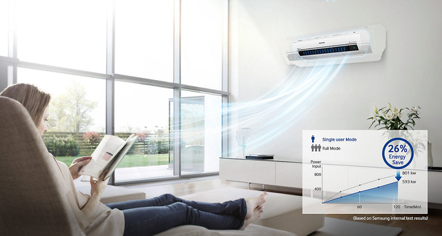 Các máy lạnh mới của Samsung còn được trang bị chế độ làm lạnh thông minh. Chế độ 2 bước này sẽ làm mát căn phòng cực nhanh với chế độ Fast Cool rồi sau đó tự động thay đổi xuống chế độ Comfort Cool để duy trì nhiệt độ như ý muốn, tránh cho căn phòng quá lạnh khiến người dùng vừa khó chịu tấm thân, vừa hao tổn hầu bao vì tiền điện. Ngoài ra, máy lạnh mới của Samsung có thêm chế độ Single User để phục vụ độ lạnh vừa cho một người sử dụng nhằm giúp giảm tiền điện.